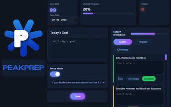 PeakPrep는 JEE 및 NEET 학생들을 위해 특별히 설계된 무료 Chrome 애드온으로, 포괄적인 학습 추적 및 집중 향상 경험을 제공합니다. 스마트 시험 카운트다운, 과목 진행 추적기 및 일일 목표 설정 기능이 포함되어 있어 학생들이 조직적이고 동기 부여를 받을 수 있도록 돕습니다. 사용자 친화적인 인터페이스는 쉬운 탐색과 사용자 맞춤화를 가능하게 하여 개인 학습 요구에 적합합니다.